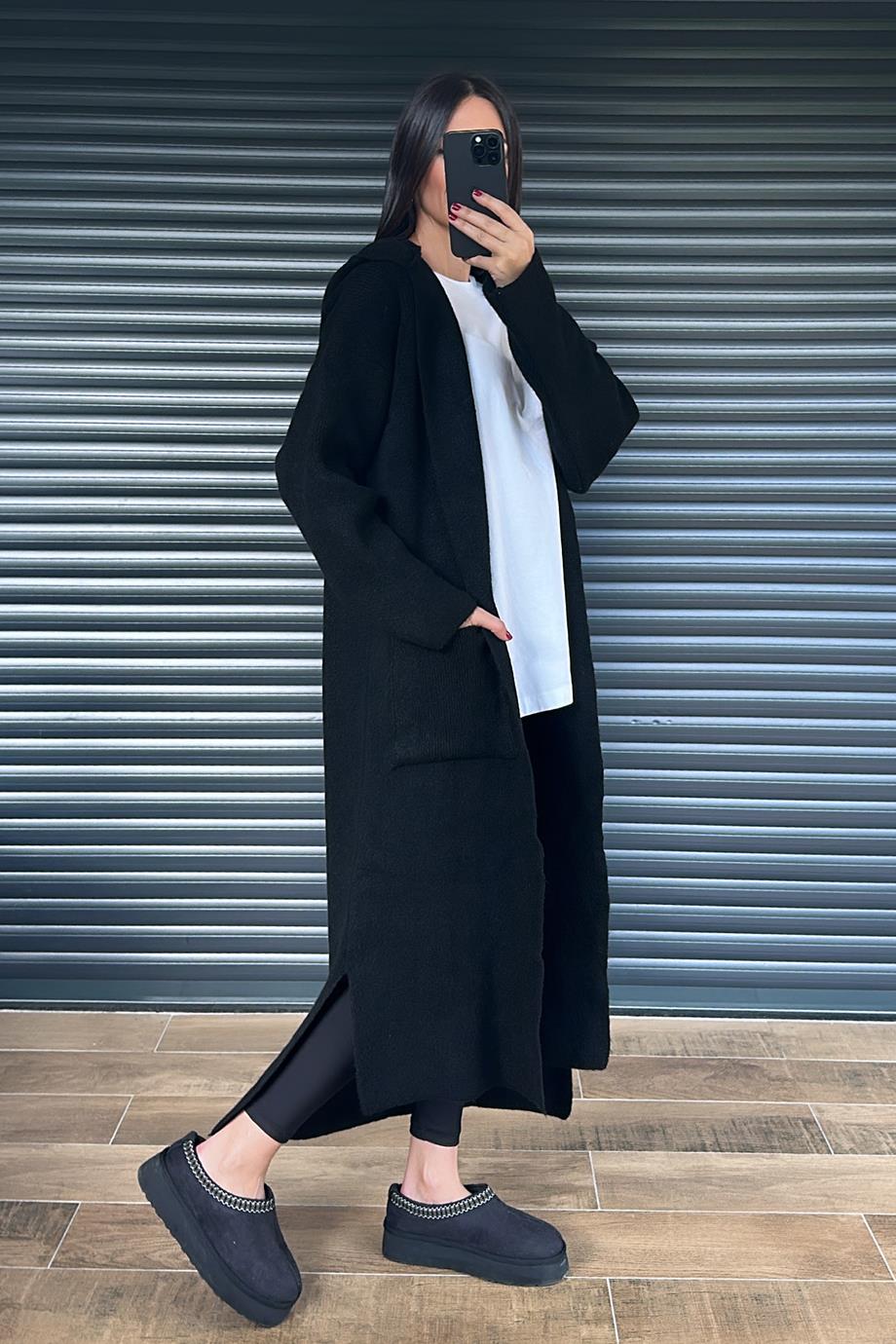 Siyah Kapüşonlu Triko Hırka